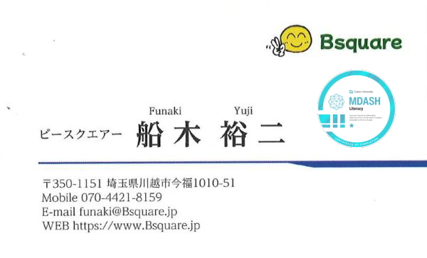 名刺情報 氏名 船木 裕二 フリガナ フナキ ユウジ name Yuji Funaki 会社名 ビースクエアー Bsquare 電話番号 070-4421-8159 Email funaki@Bsquare.jp ホームページ https://Bsquare.jp/